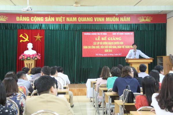 Chiều ngày 24/3/2017, Trường Chính trị Tô Hiệu phối hợp với Ban Tổ chức Thành ủy Hải Phòng tổ chức Lễ bế giảng các Lớp Bồi dưỡng ngạch chuyên viên dành cho công chức, viên chức khối Đảng, đoàn thể thành phố năm 2016. Tới dự, có đồng chí Nguyễn Văn Hiểu - Phó Hiệu trưởng Trường; đại diện lãnh đạo các khoa, phòng nhà trường cùng toàn thể 127 học viên của 02 Lớp.