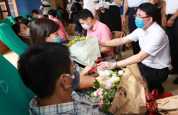 Đồng chí Lê Khắc Nam tặng hoa cho người tham gia hiến máu tình nguyện