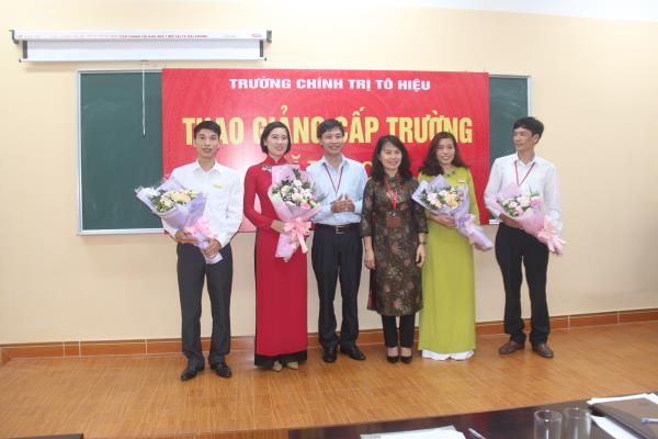 Đồng chí Trần Thị Bích Hằng - Hiệu trưởng Trường và đồng chí Nguyễn Văn Hiểu - Phó Hiệu trưởng Trường tặng hoa chúc mừng các giảng viên thao giảng