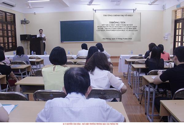 Sáng ngày 21/9/2018, Trường Chính trị Tô Hiệu tổ chức buổi thông tin về “Kết quả thực hiện Nghị quyết số 29-NQ/TW ngày 04/11/2013 của Ban Chấp hành Trung ương khóa XI về đổi mới căn bản, toàn diện giáo dục và đào tạo”. Tới dự có đồng chí Trần Thị Bích Hằng - Bí thư Đảng ủy, Hiệu trưởng Trường; các đồng chí Phó Hiệu trưởng; cán bộ, viên chức Nhà trường cùng toàn thể học viên lớp Trung cấp lý luận chính trị - hành chính, hệ tập trung, khóa 26. Buổi thông tin do đồng chí Nguyễn Văn Kính - Phó Bí thư Đảng ủy, Phó Hiệu trưởng Trường trực tiếp truyền đạt.
