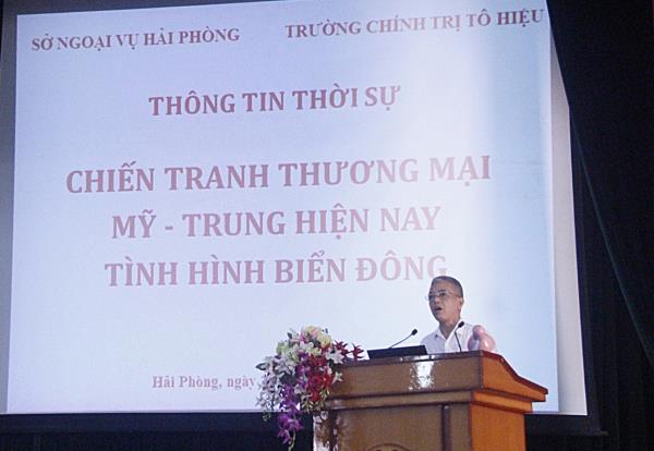 “Chiến tranh thương mại Mỹ - Trung hiện nay. Tình hình Biển Đông”. Tham dự buổi thông tin thời sự có các đồng chí: Nguyễn Thị Bích Dung - Phó Giám đốc Sở Ngoại vụ Thành phố Hải Phòng, Nguyễn Văn Hiểu - Phó Hiệu trưởng Trường Chính trị Tô Hiệu, cán bộ, viên chức, giảng viên các đơn vị nhà trường cùng học viên một số lớp Trung cấp lý luận chính trị - hành chính đang học tập tại Trường. Đồng chí Bùi Thế Giang - Nguyên Đại sứ Việt Nam tại Liên Hợp Quốc, Nguyên Vụ trưởng Vụ Tây Âu - Bắc Mỹ, Ban Đối ngoại Trung ương Đảng trực tiếp truyền đạt nội dung thông tin.