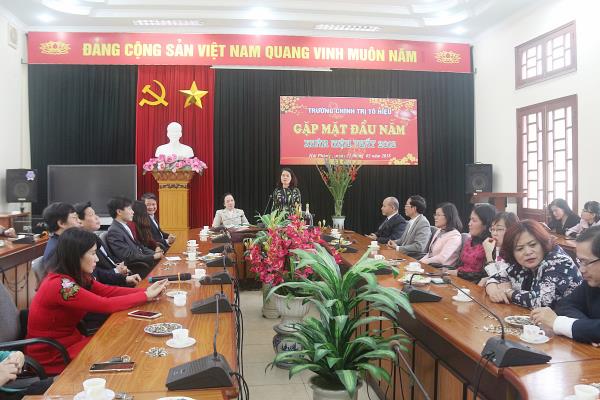 Trong không khí ấm áp, thân tình của buổi làm việc đầu Xuân, đồng chí Trần Thị Bích Hằng - Bí thư Đảng ủy, Hiệu trưởng trường đã trân trọng gửi lời chúc sức khỏe, hạnh phúc, an khang, đạt nhiều thắng lợi trong năm công tác 2018 tới toàn thể cán bộ, viên chức, người lao động nhà trường. Đồng chí nhấn mạnh năm 2017, với tinh thần đoàn kết, phát huy trí tuệ tập thể và sự cố gắng nỗ lực của mỗi cá nhân, nhà trường đã thực hiện thắng lợi nhiệm vụ chính trị do thành phố giao phó trên tất cả các mặt công tác, đúng tinh thần chỉ đạo của Thành ủy, UBND thành phố và Học viện Chính trị Quốc gia Hồ Chí Minh. Công tác giảng dạy và nghiên cứu khoa học được chú trọng, nâng cao chất lượng; chất lượng xây dựng đội ngũ cán bộ, giảng viên nhà trường được củng cố, phát triển; cơ sở vật chất phục vụ công tác đào tạo, bồi dưỡng cán bộ được thành phố quan tâm đầu tư, xây mới một số hạng mục, nhất là khu giảng đường mới theo Quy hoạch của thành phố đã khánh thành, đi vào hoạt động phục vụ tốt hơn yêu cầu công tác của nhà trường; chất lượng công tác đào tạo, bồi dưỡng cán bộ được nâng lên một bước, đáp ứng yêu cầu xây dựng và phát triển thành phố trong giai đoạn hiện nay.