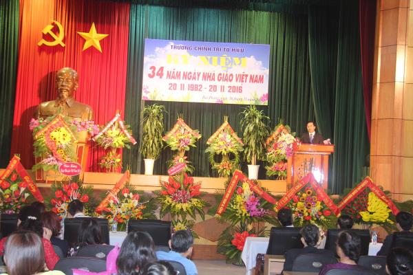 Tại Lễ kỷ niệm, đồng chí Trần Thị Bích Hằng – Hiệu trưởng nhà Trường ôn lại truyền thống lịch sử 34 năm ngày Nhà giáo Việt Nam. Ngày 20-11 đã trở thành ngày truyền thống tốt đẹp của dân tộc Việt Nam. Ngày của các Nhà giáo, nhưng không chỉ là ngày lễ hội của một ngành nghề, của riêng các thầy cô giáo mà đã trở thành ngày vui chung, ngày xã hội tôn vinh đạo học, tôn vinh những người làm công tác đào tạo, bồi dưỡng. Đồng chí báo cáo những kết quả mà nhà trường đã đạt được trong năm 2016 trên các mặt công tác. Về hoạt động chuyên môn, nhà trường đã hoàn thành kế hoạch đào tạo, bồi dưỡng; trong công tác Nghiên cứu Khoa học, đã tổ chức thành công các Hội thảo “Áp dụng phương pháp giảng dạy tích cực” và “Quán triệt, vận dụng Nghị quyết Đại hội Đảng toàn quốc lần thứ XII vào giảng dạy”; hoàn thành thao giảng cấp Trường với tỉ lệ 100% giảng viên tham gia đạt loại Giỏi.