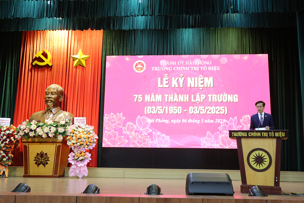 Thay mặt Lãnh đạo Nhà trường, TS Nguyễn Kim Pha, Bí thư Đảng ủy, Hiệu trưởng Trường đã ôn lại những chặng đường lịch sử, báo cáo thành tích Trường đã đạt được qua 75 năm xây dựng và phát triển, đặc biệt là giai đoạn 5 năm (2021 – 2025); đồng thời nêu lên những định hướng phát triển Nhà trường trong thời gian tới. Báo cáo khẳng định: 75 năm qua, Trường Chính trị Tô Hiệu đã không ngừng lớn mạnh và trưởng thành về nội lực. Trường đã khẳng định được vai trò đặc biệt quan trọng đối với công tác đào tạo, bồi dưỡng đội ngũ cán bộ, đảng viên cho thành phố cũng như vị thế của mình trong hệ thống các trường chính trị trên cả nước. Đồng chí nhấn mạnh những nỗ lực, quyết tâm của đội ngũ viên chức nhà trường trong quá trình xây dựng trường chính trị chuẩn mức 2 theo Quy định số 11-QĐ/TW của Ban Bí thư; đồng thời khẳng định: 75 năm là hành trình lao động và sáng tạo, hành trình xây đắp, tạo dựng những giá trị để tạo nên một thương hiệu trường Đảng Tô Hiệu hôm nay với những truyền thống tốt đẹp mà các thế hệ cán bộ, giảng viên, viên chức đã tạo dựng lên, là những giá trị tinh thần, thế hệ hôm nay sẽ giữ gìn, tiếp tục kế thừa và phát triển trong thời kỳ mới, để hoàn thành sứ mệnh vẻ vang đào tạo, bồi dưỡng đội ngũ cán bộ cho thành phố. Nhà trường quyết tâm xây dựng môi trường giáo dục kỷ cương, thân thiện, giàu tính đảng; ở đó mỗi cán bộ, giảng viên, viên chức sẽ luôn mang trong mình khát khao được cống hiến, quyết tâm xây dựng Trường ngày càng phát triển.