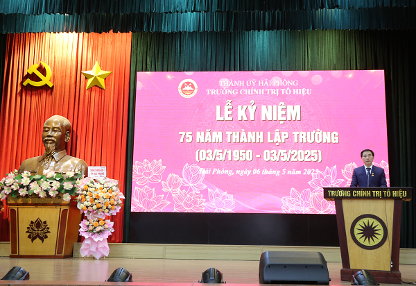 Phát biểu tại buổi Lễ, PGS.TS Hoàng Phúc Lâm, Phó Bí thư Đảng ủy, Phó Giám đốc Học viện Chính trị quốc gia Hồ Chí Minh đánh giá cao những kết quả đạt được của nhà trường trong thời gian vừa qua trên tất cả các mặt, từ công tác đào tạo, bồi dưỡng; nghiên cứu khoa học, tổng kết thực tiến đến xây dựng đội ngũ. Lãnh đạo Học viện rất tin tưởng vào Trường Chính trị Tô Hiệu; tin tưởng vào sự quan tâm của lãnh đạo thành phố đối với sự phát triển của nhà trường, nên Học viện đã lựa chọn Hải Phòng, lựa chọn Trường Chính trị tô Hiệu là nơi đăng cai tổ chức Hội thi giảng viên dạy giỏi các trường chính trị, trường bộ ngành lần thứ IX; những thành tích Trường Chính trị Tô Hiệu đạt được là kết quả của sự đoàn kết và kế thừa truyền thống, với quyết tâm vượt qua mọi khó khăn, thử thách, với khát vọng bứt phá, với tinh thần dám nghĩ, dám làm, dám đột phá vì tập thể; với trí tuệ, trách nhiệm của tập thể cán bộ, viên chức, người lao động Nhà trường qua nhiều thế hệ. Đồng chí đề nghị thời gian tới, nhà trường chủ động phối hợp cùng Trường Chính trị tỉnh Hải Dương triển khai các công việc sắp xếp tổ chức bộ máy khi sáp nhập theo đúng sự chỉ đạo của Trung ương và thành phố Hải Phòng; tiếp tục rà soát các chỉ tiêu chuẩn mức 2 sau sáp nhập; bám sát các nhiệm vụ chính trị của nhà trường trong đó đặc biệt quan tâm xây dựng đội ngũ cán bộ, giảng viên đủ mạnh, vững vàng về bản lĩnh chính trị, giỏi về chuyên môn nghiệp vụ, trong sáng về đạo đức, lối sống, thực sự là tấm gương sáng cho học viên noi theo. Đồng chí đề nghị Thành ủy, HĐND, UBND thành phố Hải Phòng tiếp tục tăng cường phối hợp với Học viện, quan tâm hơn nữa về mọi mặt đối với Trường Chính trị Tô Hiệu, xây dựng trường xứng tầm với vị thế của một cơ sở đào tạo, bồi dưỡng cán bộ duy nhất cấp thành phố.